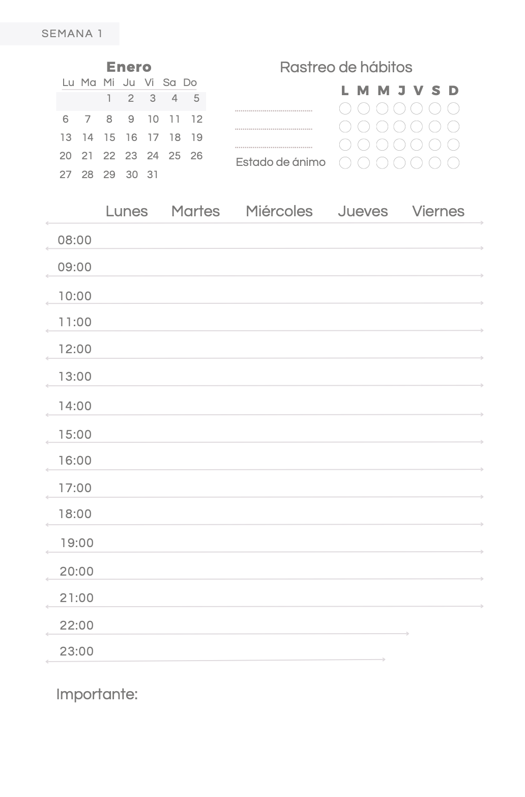Te permite una Organización Eficiente: Con un formato limpio y sencillo, esta agenda te permite reflexionar diariamente, manteniendo el enfoque en tus objetivos, hábitos y reflexiones.