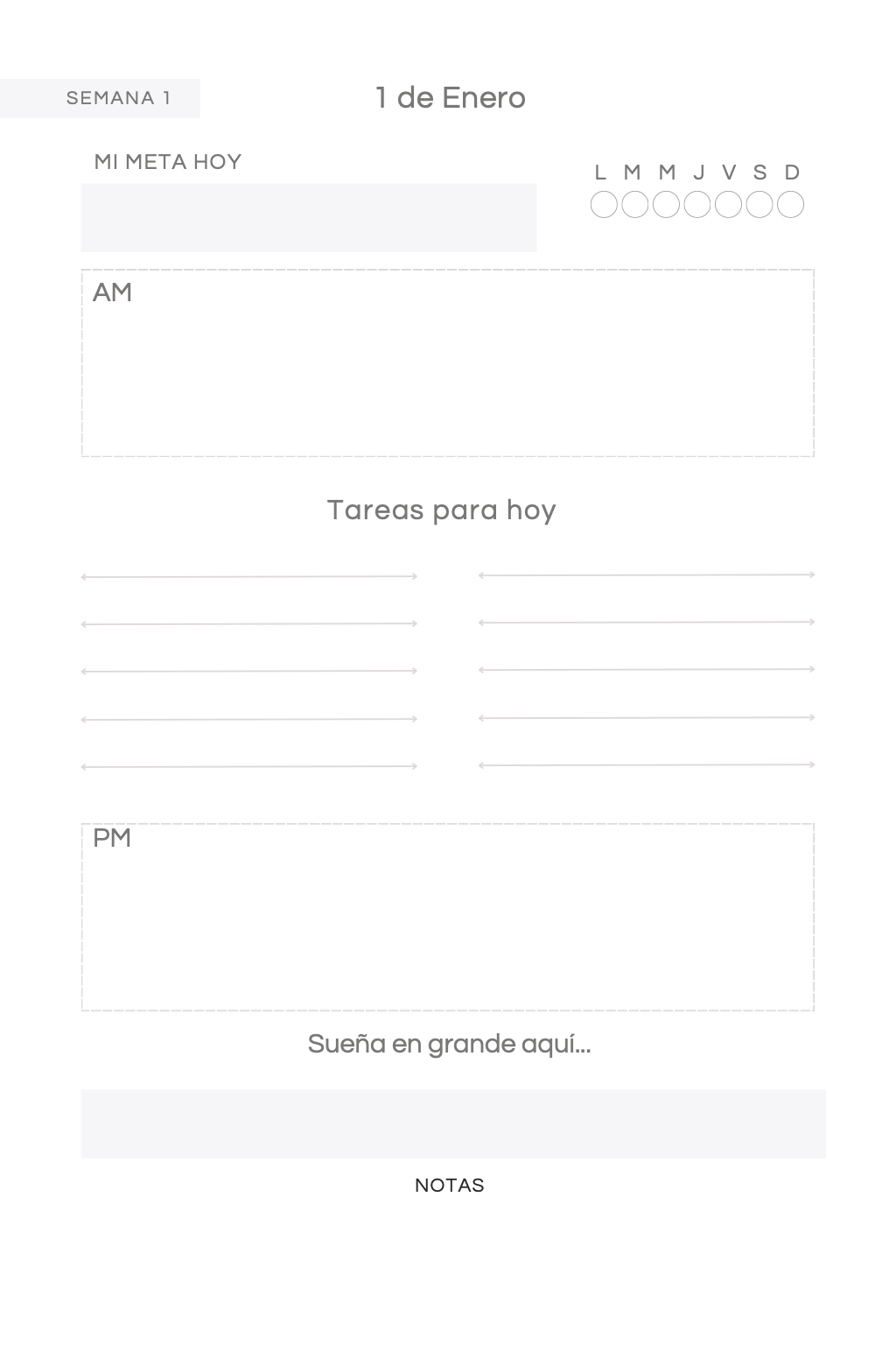 Tiene Diseño Elegante y Funcional: con formato día página para registrar tus pensamientos, tus tareas y metas.