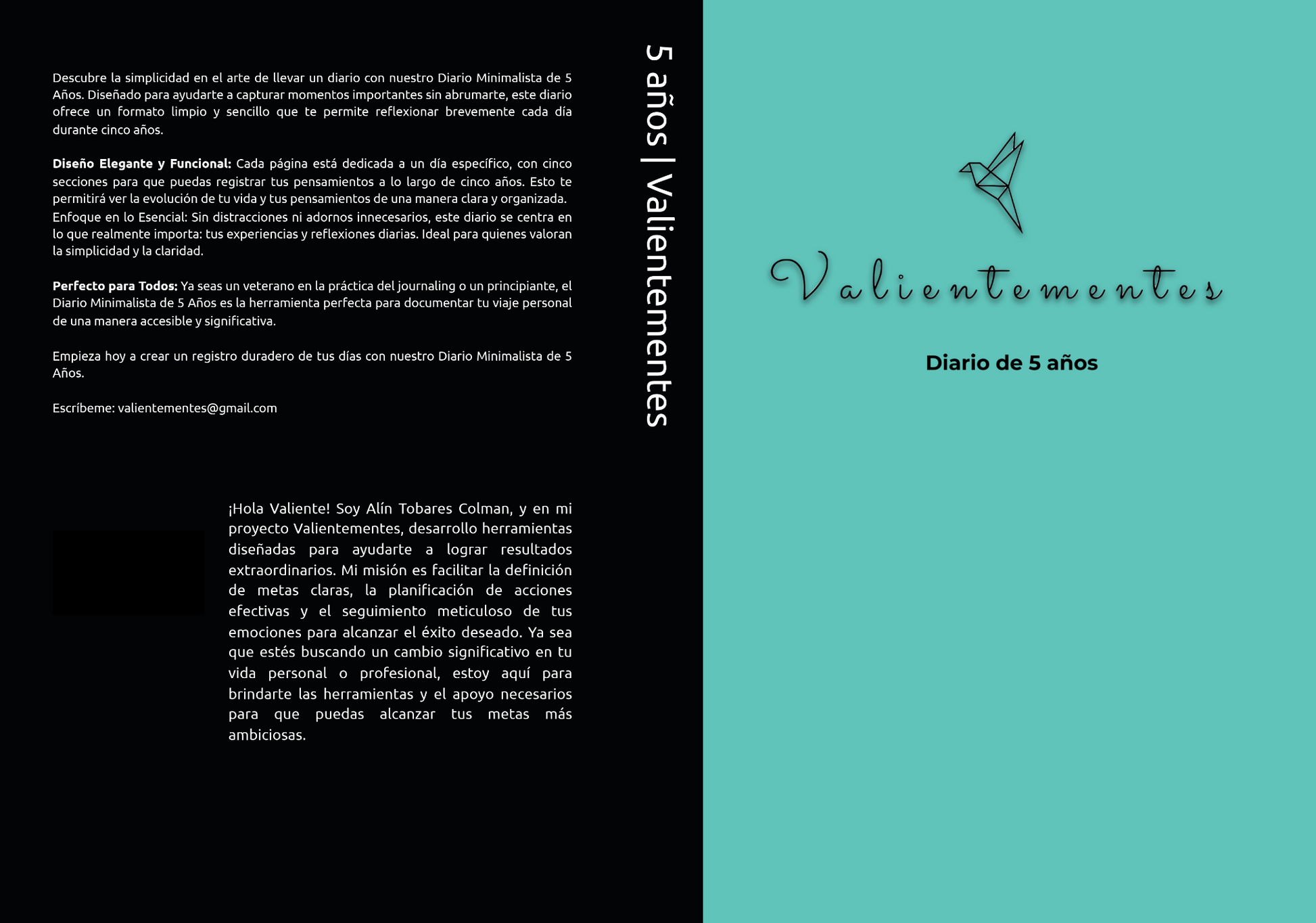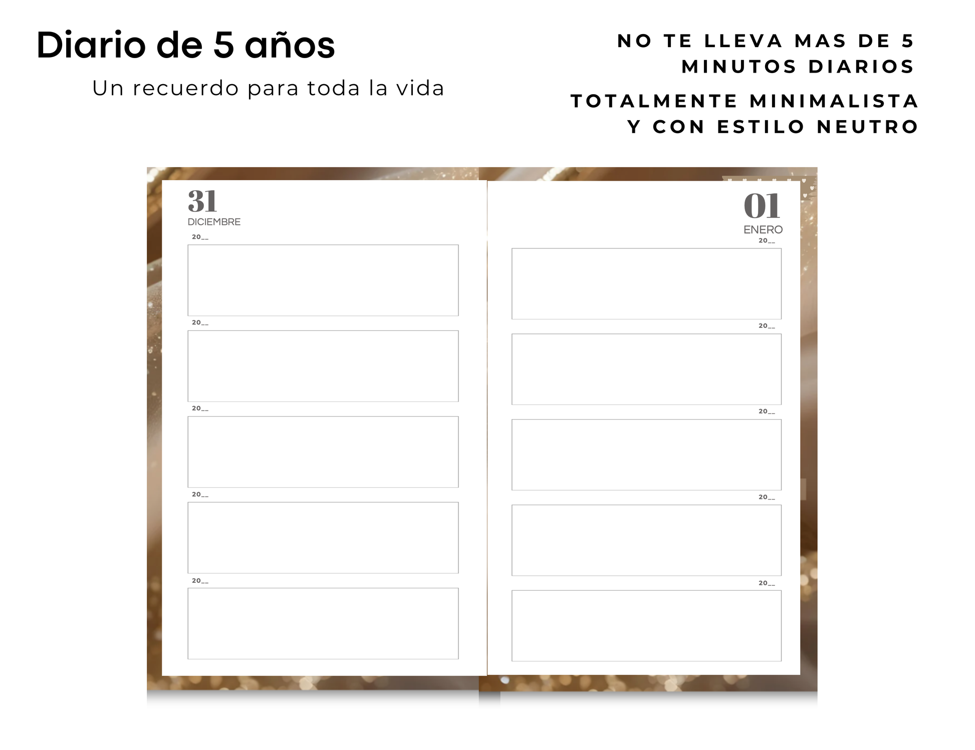 Descubre la simplicidad en el arte de llevar un diario con nuestro Diario Minimalista de 5 Años. El diario Valientementes fue diseñado para ayudarte a capturar momentos importantes sin abrumarte, este diario ofrece un formato limpio y sencillo que te permite reflexionar brevemente cada día durante cinco años.